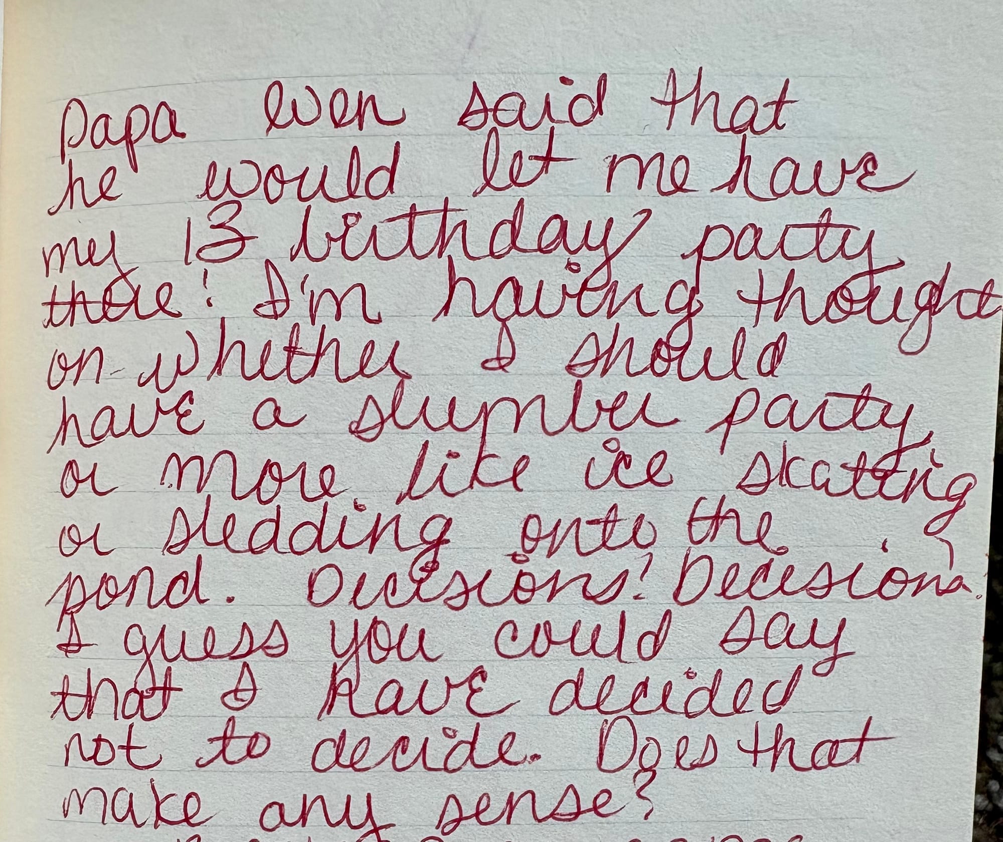 Ever since three 45 this afternoon I've been at Papa & Grandma B's new cabin. Though you can hardly call it a cabin. More like mini-mansion. It's huge. There is the biggest, nicest dance attic up there. Papa even said that he would let me have my 13 birthday party there! I'm having thoughts on whether I should have a slumber party or more like ice skating or sledding onto the pond. Decisions! Decisions! I guess you could say I have decided not to decide. Does that make any sense? It's 10:00 now, so BYE! "