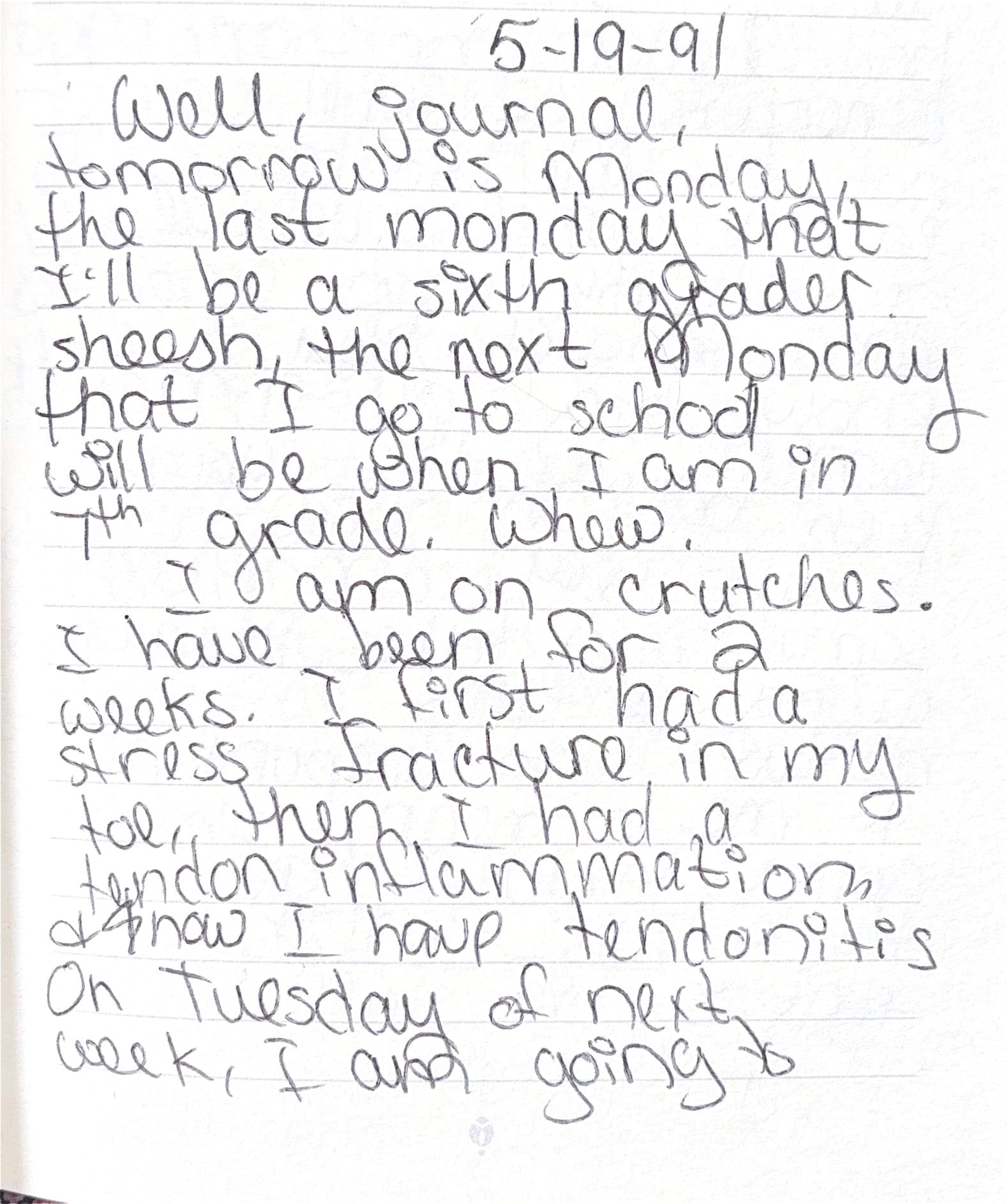 We're hopping back to 1991 today, with an entry towards the end of my 6th grade year. I have an injury (one that may or may not have been made up in order to join a club...), and now I may not get to dance in my dance recital! What have I done??