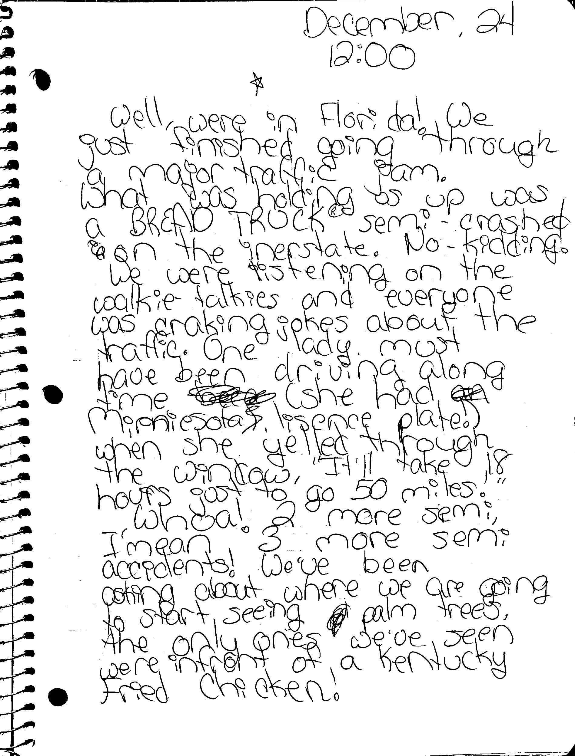 Without screens or video games to play, I'm left to look out the window and document what my parents are saying about the trip. My observations are hilarious, including the curious lack of palm trees.