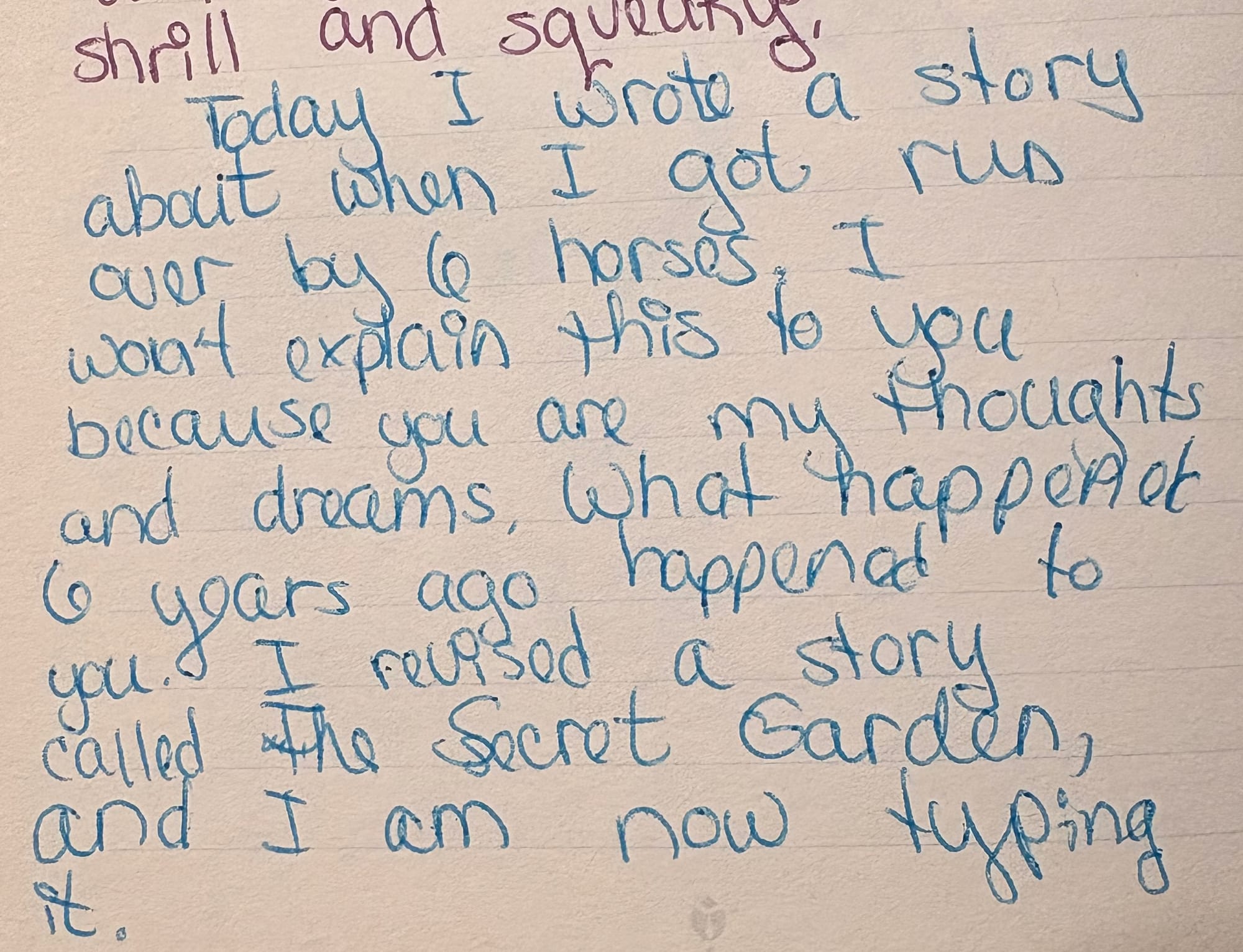 Today, I wrote a story about when I got run over by six horses. I won't explain this to you because you are my thoughts and dreams. What happened six years ago happened to you!