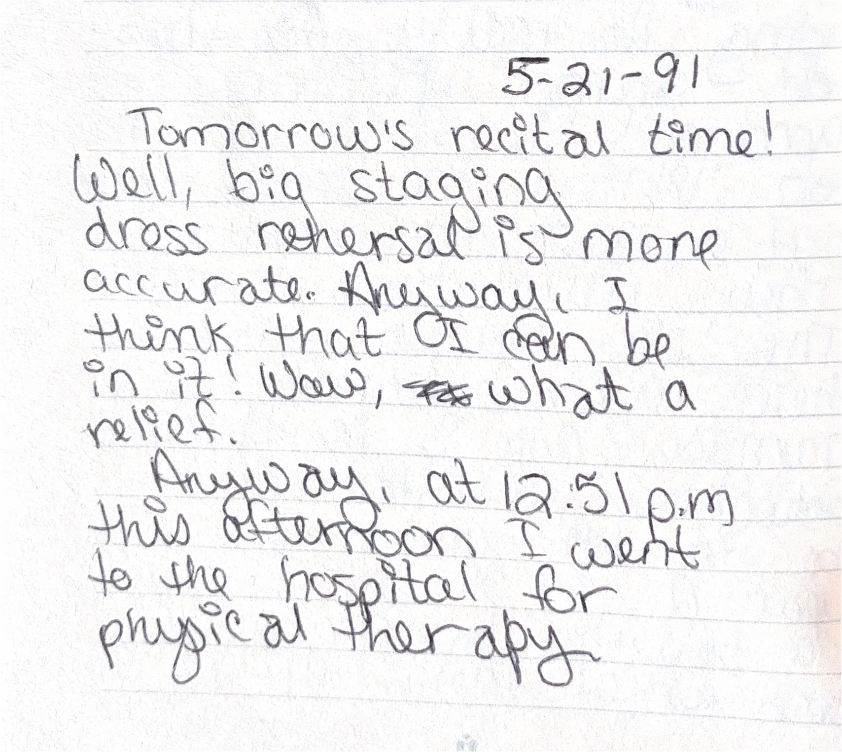 Hello and thanks for being here! Today's entry is from May 21, 1991. We get to find out if my questionable foot injury is going to keep me from dancing in my first recital at my new dance school. If you've just found your way to my little corner of the interweb, welcome! (And read this entry first to find out more.)